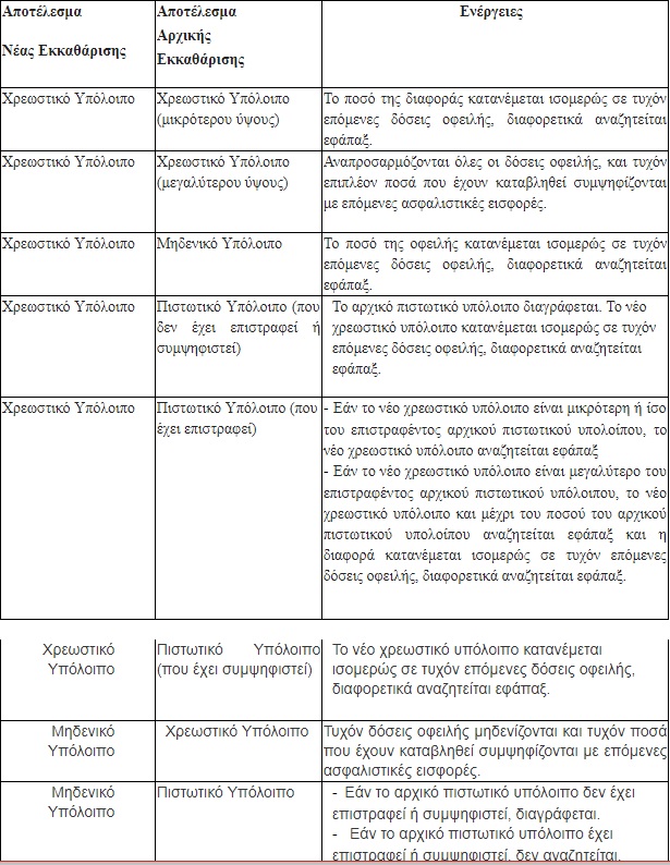 α) Εάν το αποτέλεσμα της αρχικής εκκαθάρισης ήταν χρεωστικό, τυχόν δόσεις οφειλής μηδενίζονται και ποσά που έχουν ήδη καταβληθεί μέσω δόσεων, καθώς και το νέο πιστωτικό υπόλοιπο, συμψηφίζονται με επόμενες ασφαλιστικές εισφορές.