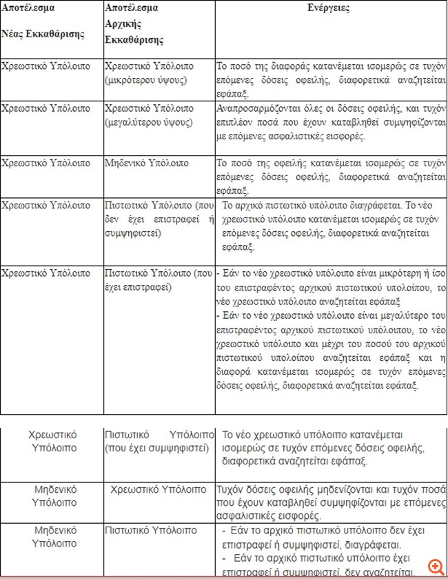 - το νέο χρεωστικό υπόλοιπο είναι μικρότερο ή ίσο με το επιστραφέν αρχικό πιστωτικό υπόλοιπο, το νέο χρεωστικό υπόλοιπο αναζητείται εφάπαξ μέχρι το τέλος του μήνα που διενεργήθηκε η νέα εκκαθάριση.