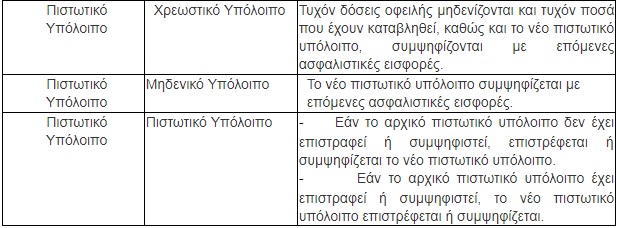 - εάν το αρχικό πιστωτικό υπόλοιπο δεν έχει επιστραφεί στον ασφαλισμένο ή δεν έχει συμψηφιστεί με επόμενες ασφαλιστικές εισφορές, τότε το αρχικό πιστωτικό υπόλοιπο διαγράφεται και επιστρέφεται στον ασφαλισμένο ή συμψηφίζεται με επόμενες ασφαλιστικές εισφορές το νέο πιστωτικό υπόλοιπο.
